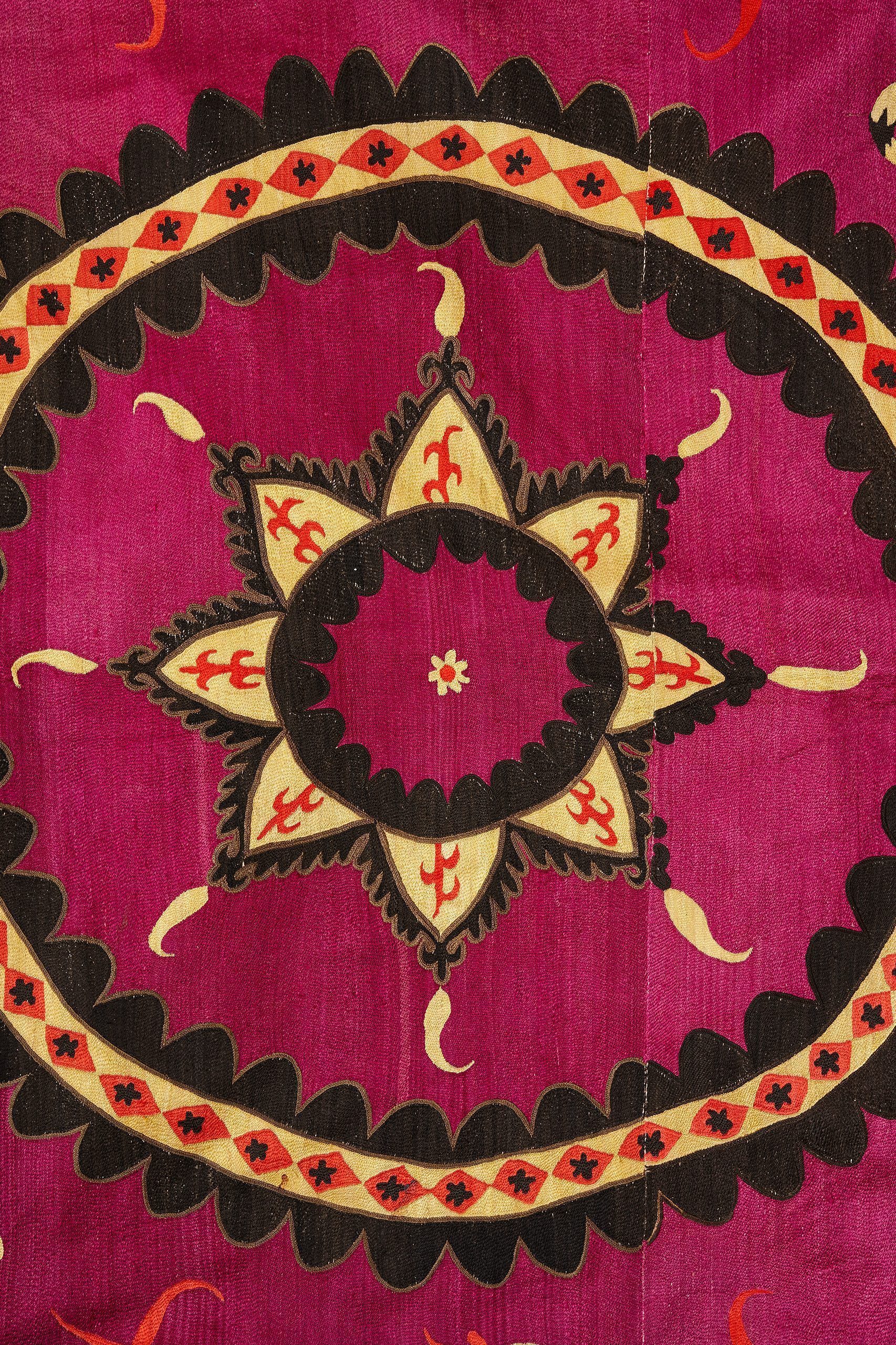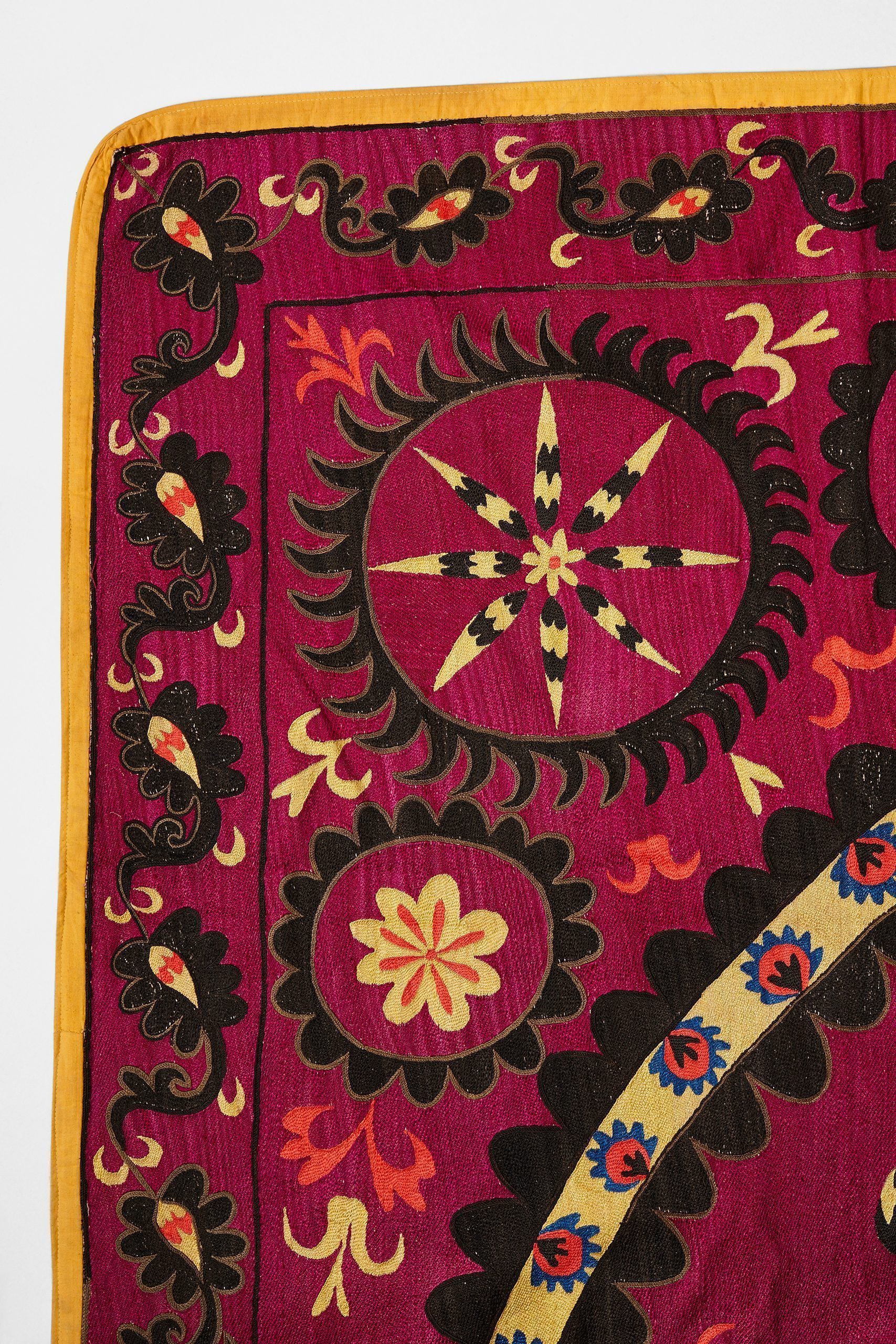 A fully hand embroidered silk Uzbek Suzani rug with symbols of ‘star sky’ or ‘moon sky’ and floral motives, snakes and stars in great condition sourced from Turkey. With a luminous purple and pink background fully covered with painstakingly detailed hand embroidery using black, yellow, orange and pink coloured motives and very small hand-stitched lucky beads, this is a magically joyful Suzani which would work well as a bed or sofa cover. It comes hand finished with a black back cover fabric and small hooks in a tasteful yellow fabric frame ready to be hung with hooks.